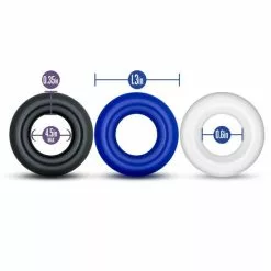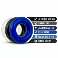 Deze drie cockringen zullen jou helpen presteren als een pro. Jij draagt ze naar wens om de penis of om de ballen. Ook kan je ze alle drie tegelijk gebruiken. Schuif 1 om de penis, 1 om de ballen en 1 om het gehele zaakje en jij zal je partner verrassen met een keiharde erectie. Ze zijn allemaal even rekbaar zodat jij ze snel en eenvoudig om kan doen en zodat ze ook perfect zijn om te gebruiken door beginners. In de kleuren zwart, blauw en transparant heb jij een vrolijke mix van cockringen. Ze zijn hygiƫnisch te reinigen onder de kraan met een milde zeep of met een toycleaner.