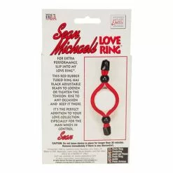 De penisring Sean Michaels Love Ring is een rubberen rode penisring met zwarte plastic knopen. De penisring is comfortabel en licht. Met de knopen kun je de penisring op de voor jou gewenste maat maken en de spanning verhogen of verlagen. Door deze penisring te gebruiken stel je de zaadlozing langer uit.