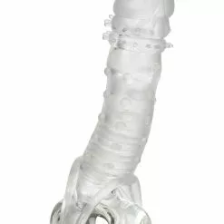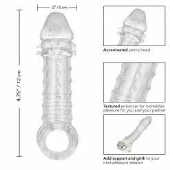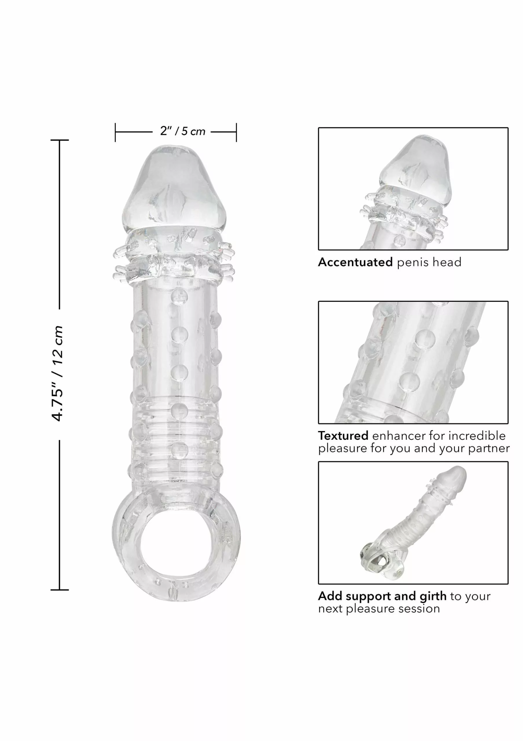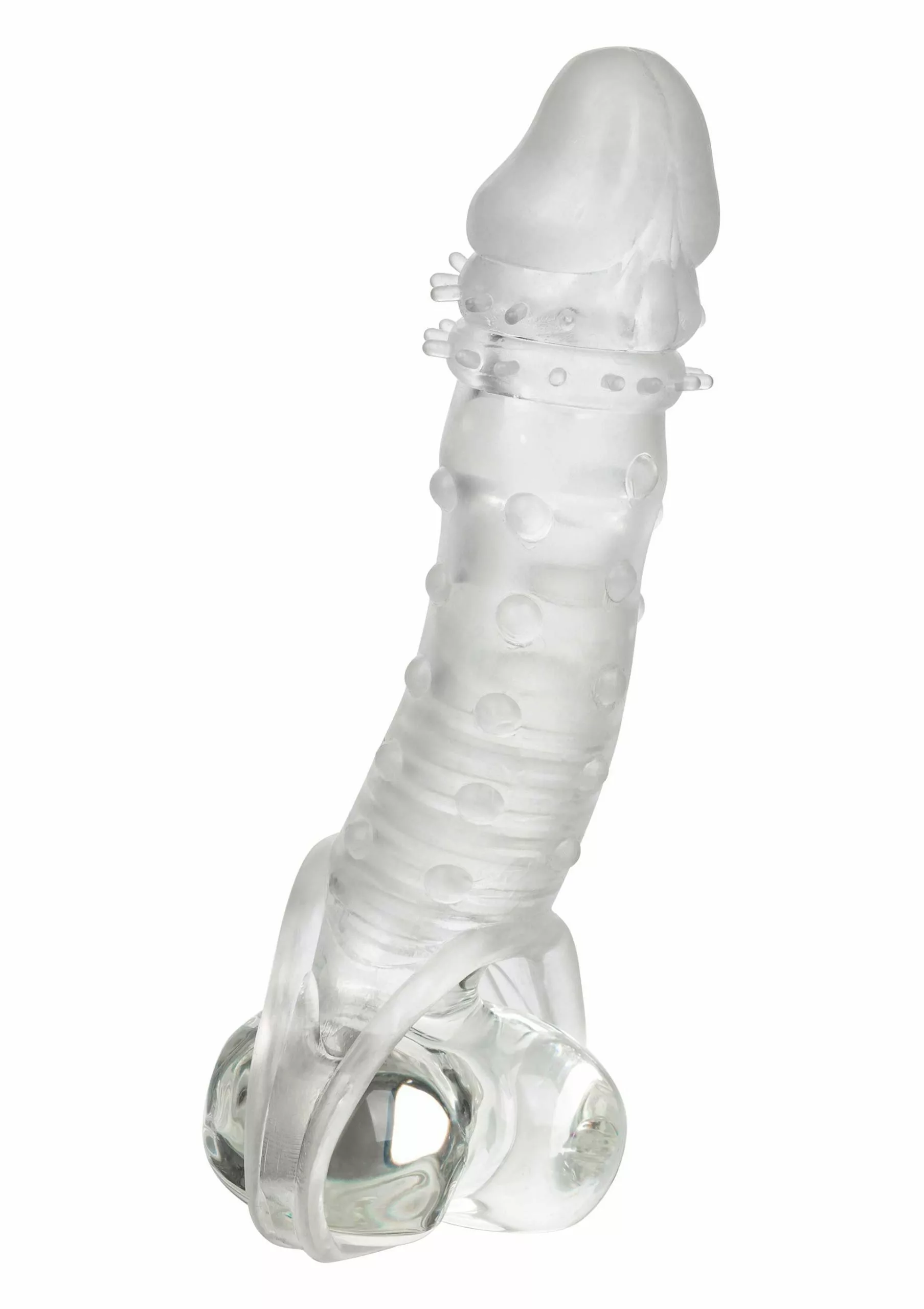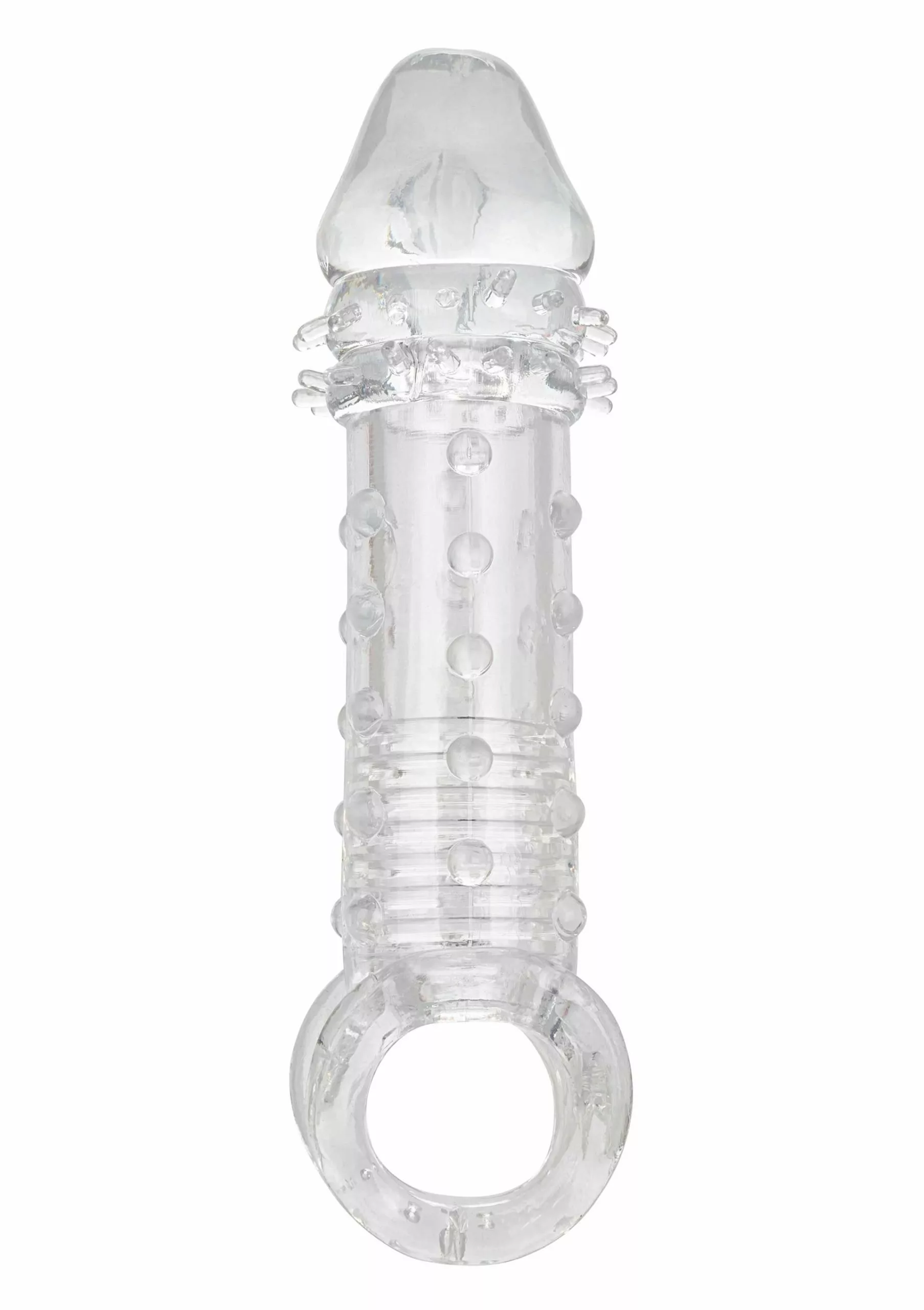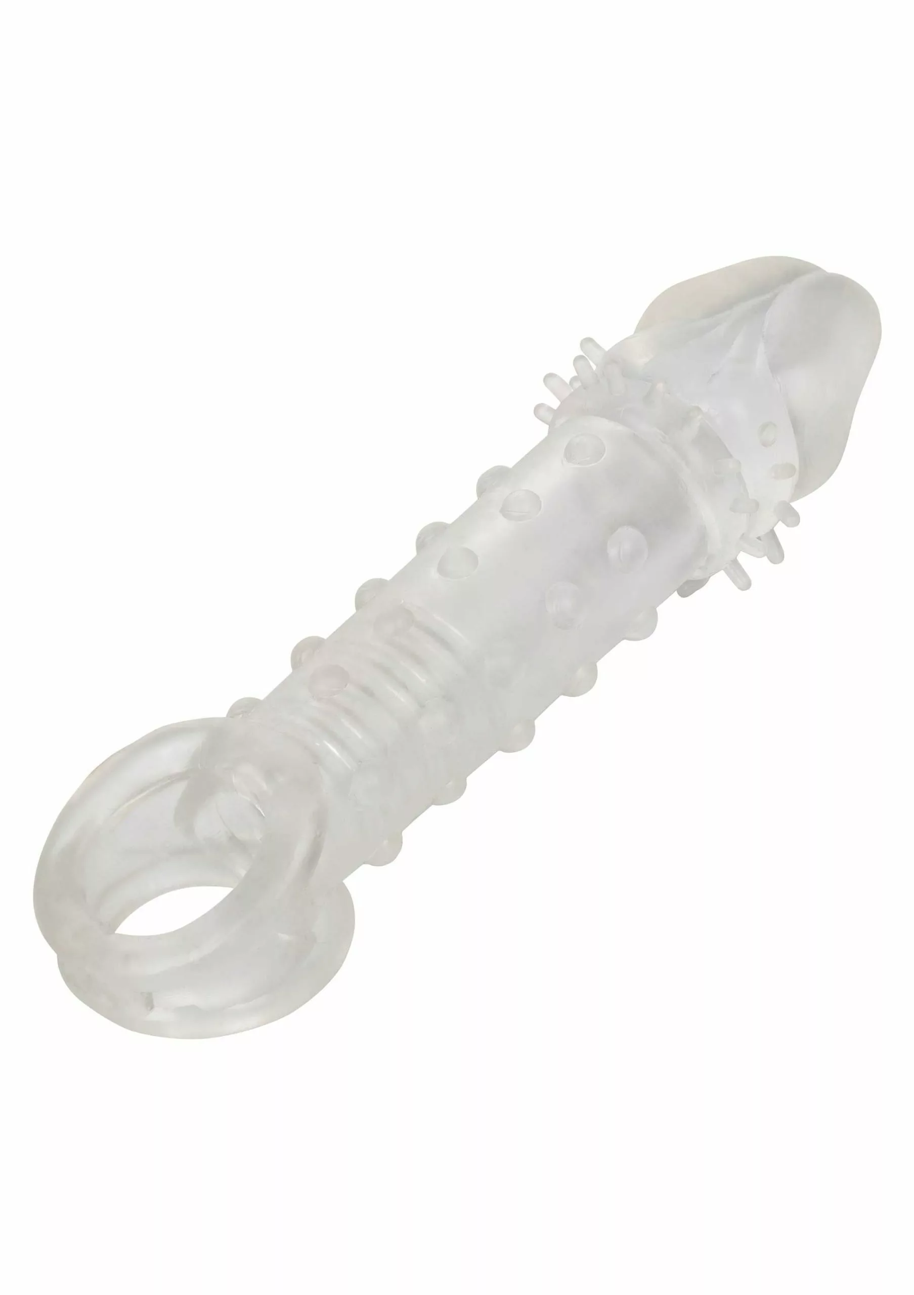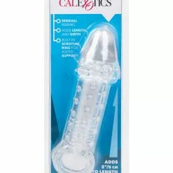 Je penis verlengen via ingrijpende operaties? Helemaal niet nodig met de Ultimate Stud Extender – Transparant van Calexotics. Deze fijne penis sleeve is gemaakt van soepel TPE en verlengt letterlijk en figuurlijk jullie liefdesspel. De Ultimate Stud Extender is 16 cm lang en heeft een inbrengbaar binnengedeelte van 11 cm. Dit betekent dat je penis met wel 5 cm verlengt wordt! Maar dat is niet het enige. De cockring zorgt voor een langer uithoudingsvermogen van hem en de noppen en studs die op de cockring en schacht zitten zorgen voor extra stimulans voor haar. Dankzij de handige scrotumband blijft de penis sleeve goed op zijn plek zitten. Met dit veelzijdige speeltje tussen de lakens komen jullie in elk opzicht nader tot elkaar.