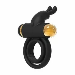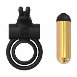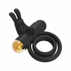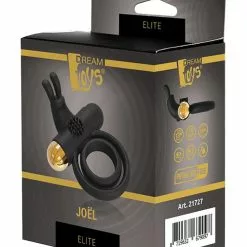 Vibrerende Cockring Elite Joel van het merk Dreamtoys ziet er door zijn goudkleurige bullet en zwarte siliconen ring zeer chic en stijlvol uit. Een cockring is een toegankelijk speeltje waarmee je voor een hoop extra plezier tussen de lakens zorgt. Een cockring zorgt voor een hardere en langer aanhoudende erectie. De vibraties van bullet zorgt via de rabbit oortjes voor gerichte clitoris stimulatie. De ring heeft 2 flexibele ringen, de kleinste met antislip structuur aan de binnenkant, de grootste flexibeler zodat hij gebruikt kan worden als scrotum ring. De vibrerende bullet heeft 7 vibratiestanden en 3 snelheden die door middel van 1 knop gemakkelijk bediend kunnen worden. De noppen op de koker om de bullet zorgt voor extra stimulatie.