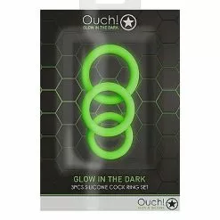 Deze Cockring Set 3 Neon Groen van Ouch! brengt licht in het duister door zijn fluoresecrende groene kleur. De set bestaat uit cockringen die comfortabel en rekbaar zijn. De Glow-In-The-Dark producten moeten worden geactiveerd met het zonlicht voordat je er in het donker van kunt genieten.