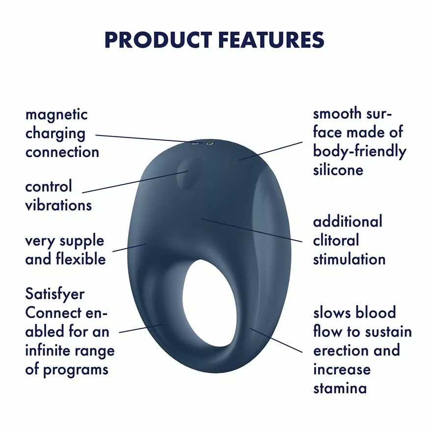 De Satisfyer Strong One Ring is een cockring met een super strak en modern design. Dit speeltje brengt een hoop extra plezier met zich mee de slaapkamer in voor zowel hem als haar. De Satisfyer Strong One Ring is gemaakt van zacht en soepel siliconen. Dit schuif je gemakkelijk om de penis en zorgt ervoor dat zijn erectie nog harder wordt en langer aanhoudt. Daarnaast hebben de vibratiepatronen een heerlijk stimulerend effect voor beide partijen. De verschillende vibratiepatronen zijn te bedienen met drukknoppen op de Strong One Ring zelf, maar ook met de gratis Satisfyer app. Hierin kun je ook je eigen stimulatieprogrammaās samenstellen. De Satisfyer Strong One Ring is volledig waterproof en oplaadbaar met bijgeleverde USB kabel.