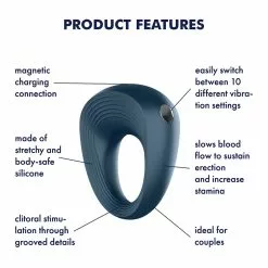De stoere, donkerblauwe Satisfyer cockring is gemaakt van donkerblauw bodysafe siliconen en is zeer rekbaar. Hierdoor past hij moeiteloos om elke penis en heeft hij voor iedere man een goede en nauwsluitende pasvorm. Het strakke gevoel voelt niet alleen heerlijk aan, maar zorgt er ook voor dat het bloed dat tijdens opwinding naar de penis stroomt, langer in de zwellichamen blijft zitten. Hierdoor houdt jouw erectie langer aan en kun je je orgasme langer uitstellen. De Satisfyer vibrerende cockring nr. 2 heeft maar liefst 10 verschillende intensieve vibratiestanden en is voorzien van extra stimulerende ribbels. De verschillende standen zijn gemakkelijk te bedienen door middel van de drukknop bovenop de ring. De krachtige vibraties zijn door je hele penis te voelen en zullen haar zowel diep van binnen als extern optimaal verwennen.