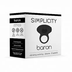 Met de vibrerende cockring Baron van het merk Simplicity zal geen vrijpartij meer hetzelfde zijn. Deze cockring stimuleert jullie gelijktijdig waardoor jullie dichterbij elkaar komen en samen klaarkomen binnen handbereik ligt. De vibrerende cockring Baron is gemaakt van zacht siliconen materiaal en is zeer rekbaar. Hierdoor past de cockring altijd en heeft hij een goede aansluitende pasvorm. Het dragen van een strakke ring rondom de penis zorgt ervoor dat zijn erectie harder is en hij zijn ejaculatie langer uit kan stellen. Terwijl het ovale gedeelte met nopjes in hartvorm er voor zorgt dat haar clitoris gestimuleerd wordt en ze eerder een hoogtepunt bereikt. De Baron cockring heeft maar liefst 10 vibratiestanden en wordt geleverd inclusief batterijen.