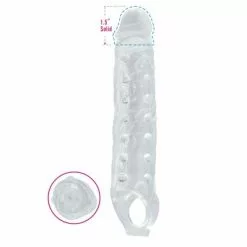 Geniet van nóg intensere seks met deze transparante verlengende penis sleeve met noppen van het merk Toyz4lovers. Deze Timeless Mightey Tusk penis sleeve beschikt over stimulerende noppen, een scrotumring en maakt je penis langer. Terwijl je partner geniet van meer lengte en omvang, zorgen de noppen ervoor dat jij optimaal gestimuleerd wordt en de scrotumring dat de penis sleeve goed blijft zitten, zelfs tijdens de meeste ruige momenten. Deze XR Brands penissleeve is gemaakt van zacht en soepel PVC materiaal, heeft een lengte van 28 cm (17 cm inbrengbaar) en een oplopende diameter van 3.50 tot 5.50 cm. De levensechte eikel voelt heerlijk aan en de sleeve verlengt je penis met maar liefst 3.80 cm. Je kunt de Timeless Mightey Tusk penis sleeve zowel voor vaginaal als anaal plezier gebruiken.