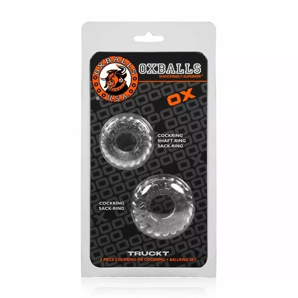 Geniet samen met je partner van jouw keiharde erectie met de transparante Truckt Cockring Oxballs. Deze cockringen set bestaat uit 2 verschillende maten ringen gemaakt van zacht TPR. Dit materiaal is niet alleen zacht, maar ook super rekbaar waardoor ze een goede pasvorm hebben en je ze kunt dragen zoals jij dat wilt. Zo kun je slechts één van de 2 cockringen dragen en hierbij afwisselen in maat (strakheid) of je kunt ze allebei tegelijk dragen. Doe er bijvoorbeeld één om de schacht van de penis en één rondom je balzak. Ontdek de verschillende manieren waarop je ze kunt dragen en de verschillende sensaties die dit teweeg brengt. Een hoop genot gegarandeerd!
