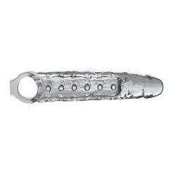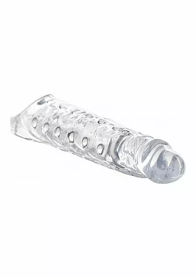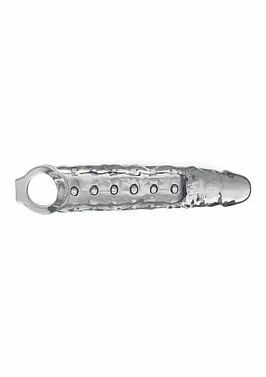Geniet van nóg intensere vrijpartijen met deze transparante verlengende penis sleeve met noppen van het merk XR Brands. De penis sleeve beschikt over stimulerende noppen, een cockring en maakt je penis langer. De penis sleeve beschikt over stimulerende noppen, een scrotumring en maakt je penis langer. De extra lengte en stimulerende noppen zijn vooral prettig voor je partner, terwijl de scrotumring ervoor dat jij een heerlijk strak gevoel ervaart en dat de penis sleeve zelfs tijdens de meeste ruige sessies goed blijft zitten. Deze XR Brands penissleeve is gemaakt van zacht en soepel TPR materiaal, heeft een lengte van 25 cm en een diameter van 5,7 cm. De levensechte eikel voelt heerlijk aan en de sleeve verlengd je penis met maar liefst 7,6 cm.